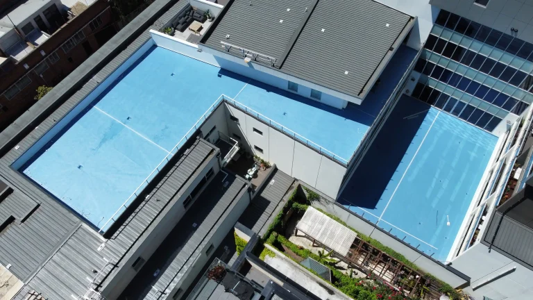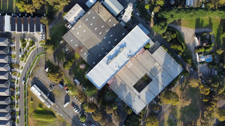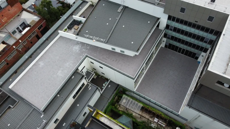 An aerial view of a building with a flat roof, showcasing a completed roofing project.