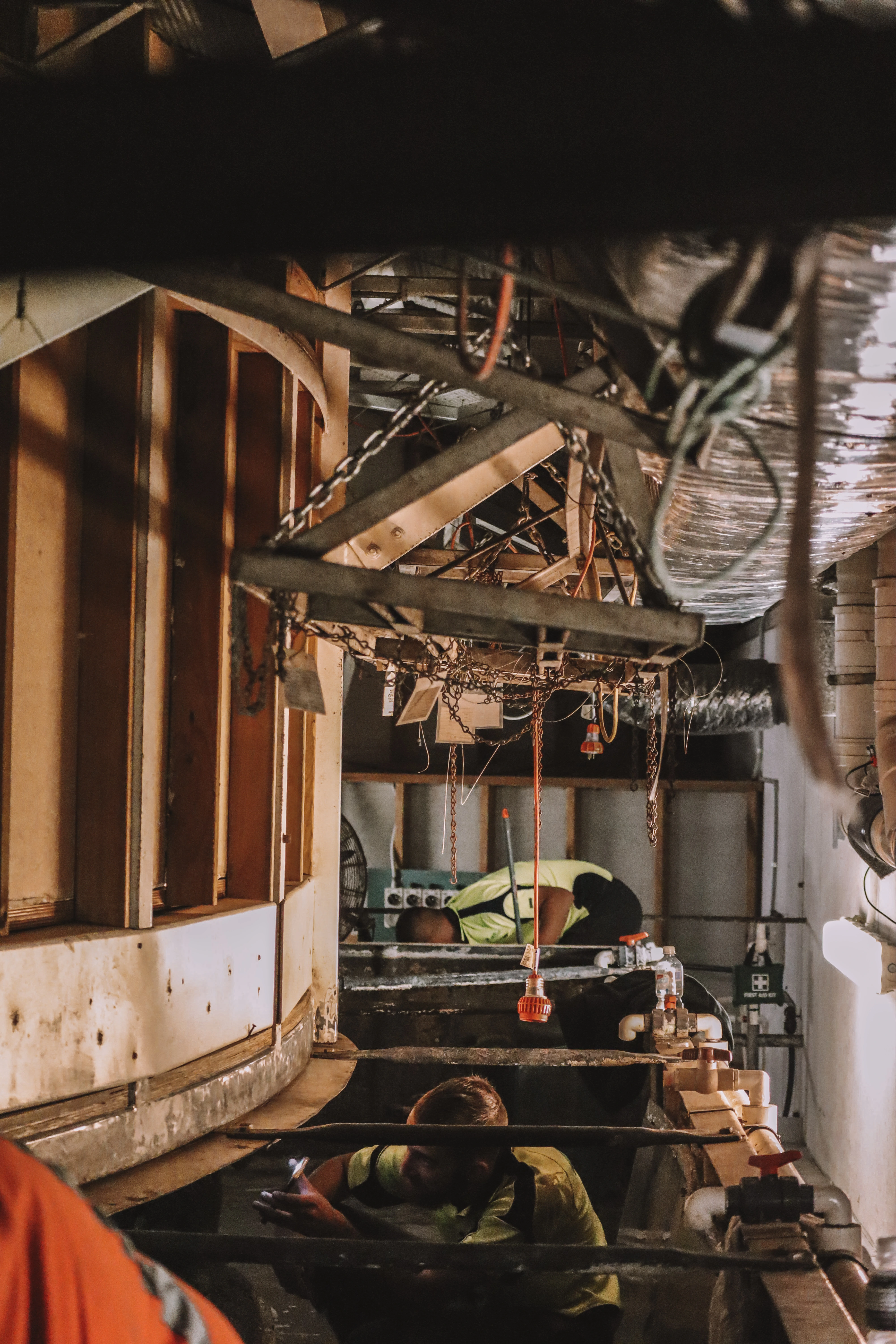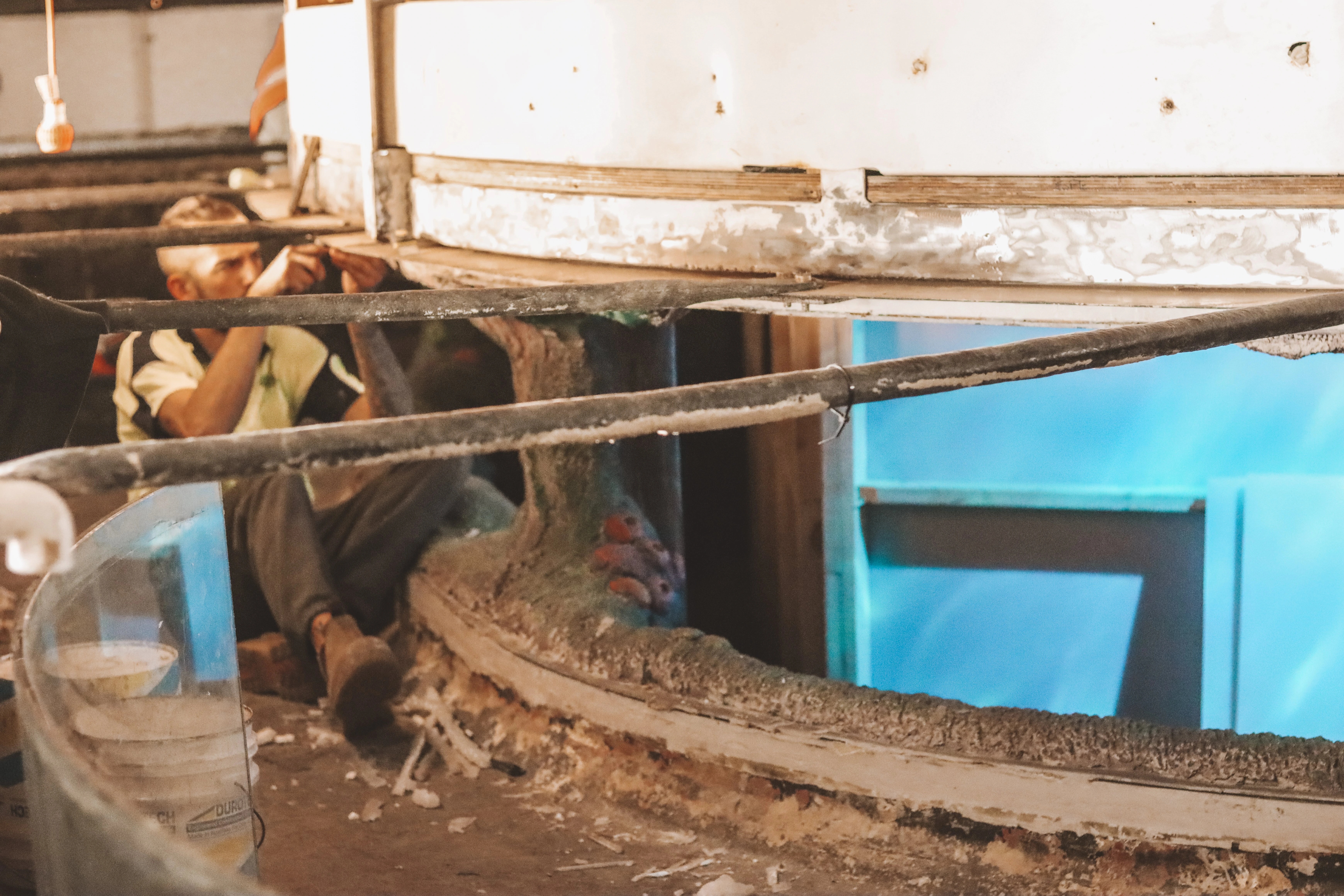 The works took place within an operational, high-traffic public venue housing live marine exhibits. Access was limited, and all tasks had to be carefully coordinated with SEA LIFE’s internal team to avoid disrupting animal care and visitor safety. One of the most critical aspects was the removal and protection of the large curved glass windows, which had to be carefully detached and stored on-site without damage. Severe corrosion was present on steel frames, support posts, and under-deck structures, requiring careful remediation to prevent further structural degradation. Additionally, concrete spalling was identified underneath the tank and walkways, with signs of rust staining and delamination, demanding precise breakout and repair to Australian standards.